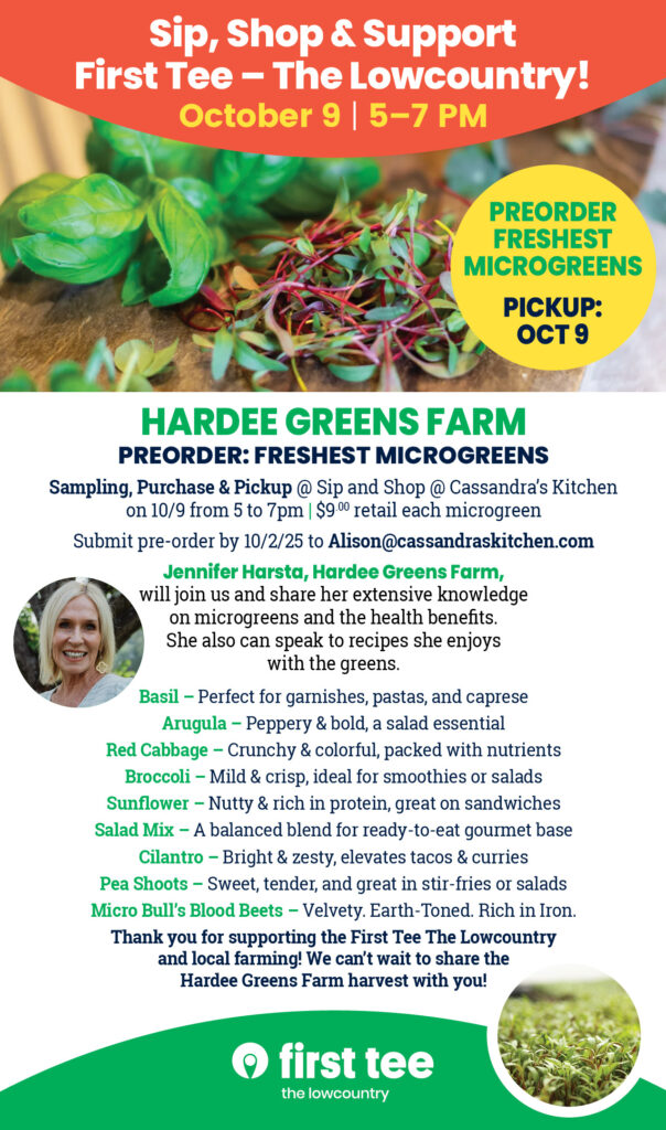 Raise a glass and shop with purpose! Join us at Cassandra’s Kitchen Store for a special evening where every purchase helps local kids build character, confidence, and life skills through the game of golf with First Tee – The Lowcountry.