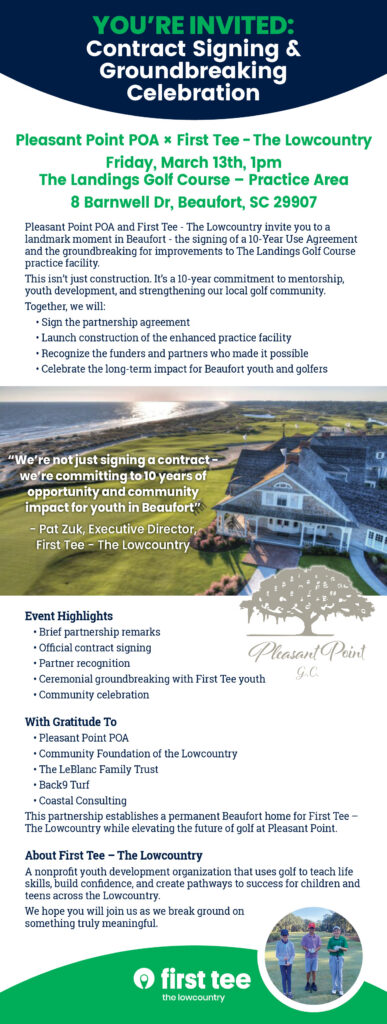 Pleasant Point Property Owners Association and First Tee – The Lowcountry will officially mark the beginning of a landmark partnership with a contract signing and ceremonial groundbreaking on Friday, March 13 at 1:00 p.m. at The Landings Golf Course Practice Area, 8 Barnwell Drive in Beaufort.